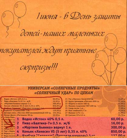 В универсаме "Солнечные продукты", радуется Наташа, детишек ждут приятные сюрпризы. БУХЛО ПОДЕШЕВЕЛО, детишки! Ура-а-а-а-а-а!