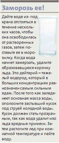 Так вот, дети, корочка льда на поверхности замерзающей воды - это не дейтерий. Дейтерий - это стабильный изотоп водорода с атомной массой, равной двум. Он может содержаться в так называемой тяжелой воде состава D2O, однако в обычной воде содержатся ее ничтожные количества. Кроме того, ядовитость дейтерия несколько ниже, чем ядовитость, например, поваренной соли. Ну и еще должен заметить, что тяжелая вода широко используется в атомной энергетике как замедлитель и стоит она довольно дорого. Так что если бы на поверхности замерзающей воды действительно бы образовывался дейтерий (ну или хотя бы концентрированная тяжелая вода) - вы бы могли заработать хорошие деньги. Но, увы, этого не происходит. Поэтому хорошие деньги зарабатывают только всякие шарлатаны, которые дурят вам голову.