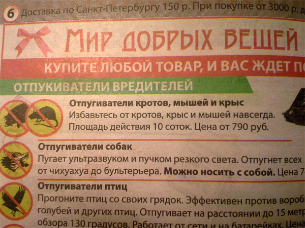 Можно носить с собой, радуется Юрий. Но если у вас много денег, тогда можете купить и стационарный отпугиватель: он отпугивает собак сразу во всем городе. Причем механизм действия кроется в заголовке рекламы - отпукиватели животных.
