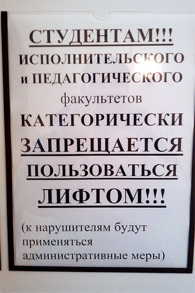 Ну как тут не вспомнить бессмертное: "Ученицам младших, а особенно старших классов категорически запрещается находиться на вокзале, особенно во время прохождения там скорого поезда на Бухарест". Правда, есть и некоторые непонятности. Ладно бы запрещали пользоваться лифтом будущим балеринам - тем надо бегать, чтобы не стать такими же толстыми, как и Волочкова. А педагогам-то зачем запрещать? Неужели из-за того, что они в лифте не тому обучаются?!!