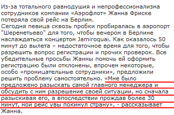 На сайте Жанны Фриске редкостная по дебилизму заметочка о том, как Жанна, явившись за 50 минут до вылета, не сумела попасть на самолет.