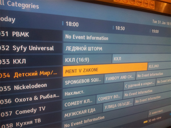 В России, чей собственно и канал, всё выглядит так же, там просто полностью название канала не влезает, "Детский мир/Телеклуб", с утра детский канал, а с вечера до утра - "Телеклуб" с сериалами.