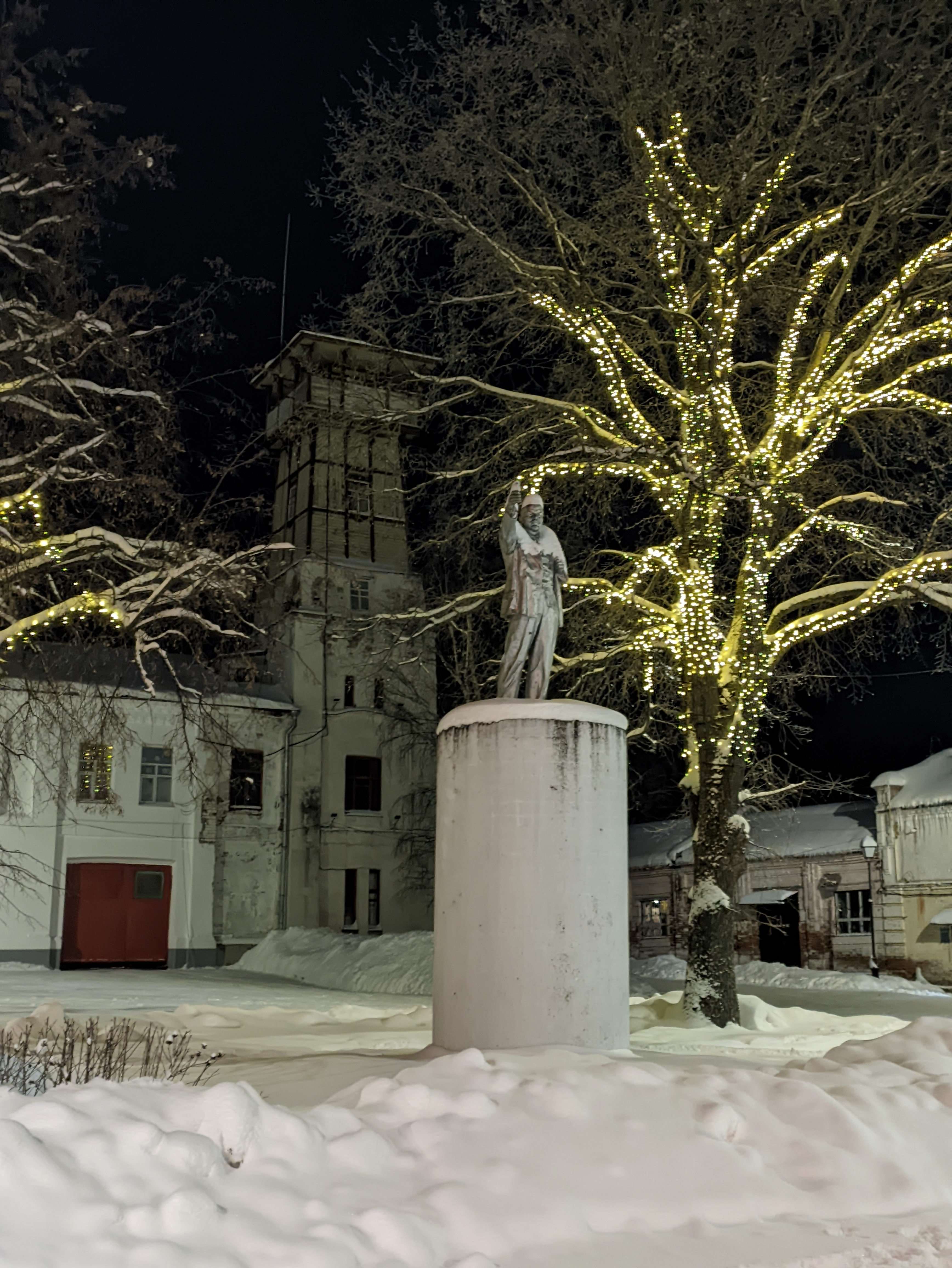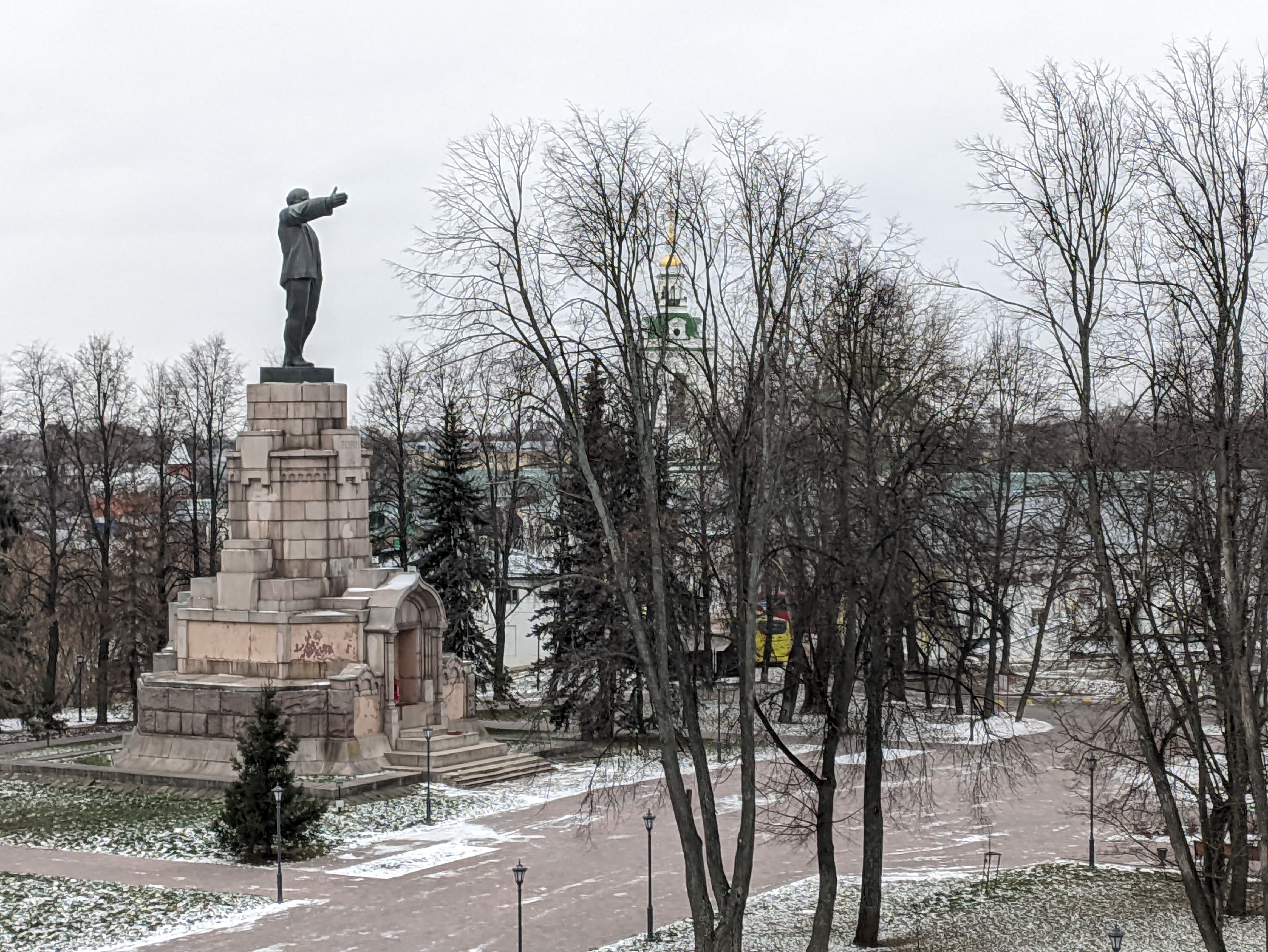 Ильич в Костроме. Жаль, у меня нет фото с правильного ракурса: если на него смотреть с другого боку, то такое ощущение, что он хорошо отпраздновал завершение первого субботника. И да, про руку вам не кажется 😉