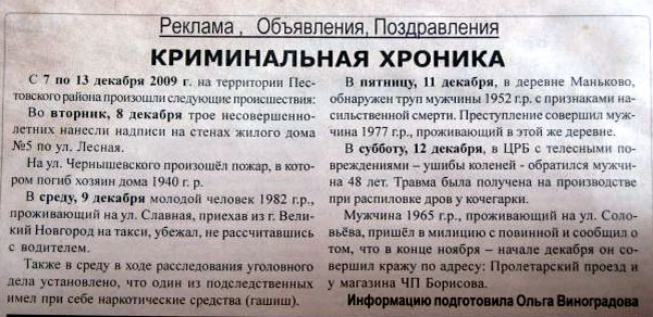 Хронику прочитал внимательно, да, казалось бы, проишествия незначительные и неважные, однако, в эту картину не вписывается "Тело мужчины с признаками насильственной смерти". Без этого сообщения, было бы смешно.