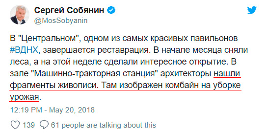В подаче материала, как интересное открытие. Это ведь удивительное дело - найти на ВДНХ графические отображения той техники, образцы (или макеты) которой, собственно, на этой выставке и демонстрировались. Ждем следующих открытий времен СССР - табличек (плакатов) по технике безопасности. Ведь в СССР страсть как любили все визуализировать. И это было страсть как давно - Собянина еще в проекте не было.