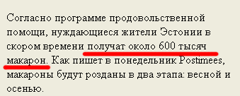 В Эстонии, рассказал Yura, бедняки наконец-то получат 600 тысяч макарон! По 102,5 макаронины на брата весной и по 154,35 макаронины осенью.