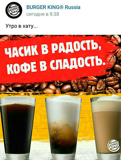 Впрочем, знающие люди подсказали, что это просто "Бургер кинг" нанял креативщика, ботающего по фене. "Часик в радость" - приветствие правильных уголовников в середине прошлого века. Ну что, тоже вариант, конешно...