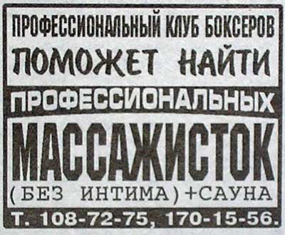 Но если, например, такая девушка не знает, куда обратиться, рекомендует Homa, нужно связаться с профессиональным клубом боксеров. Они помогут. Правда, что такое массажистка без интима - никто не знает, но раз там фигурирует слово "сауна" - значит, все в порядке.