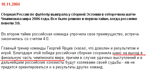 С одной стороны, не придерешься: если появился шанс хотя бы на участие в чемпионате мира, то теоретически есть шанс на выход в финал. Чисто теоретически. Весьма чисто теоретически. Ну, хотя бы в светлых мечтах того самого новостиста, который это написал... Особенно если учесть, что футболистов он почему-то назвал хоккеистами. Тогда у них точно есть шанс обыграть футболистов!