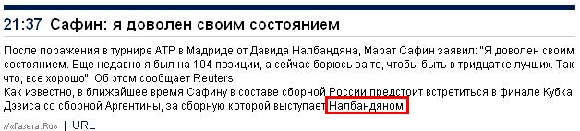 Дмитрий в "Газете.ру" прочитал сенсацию! Оказывается, Сафин также выступает Налбандяном. Типа как под псевдонимом. Причем еще ухитряется играть сам с собой - для отвода глаз! И своим состоянием - примерно пятнадцать миллионов долларов - вполне доволен.