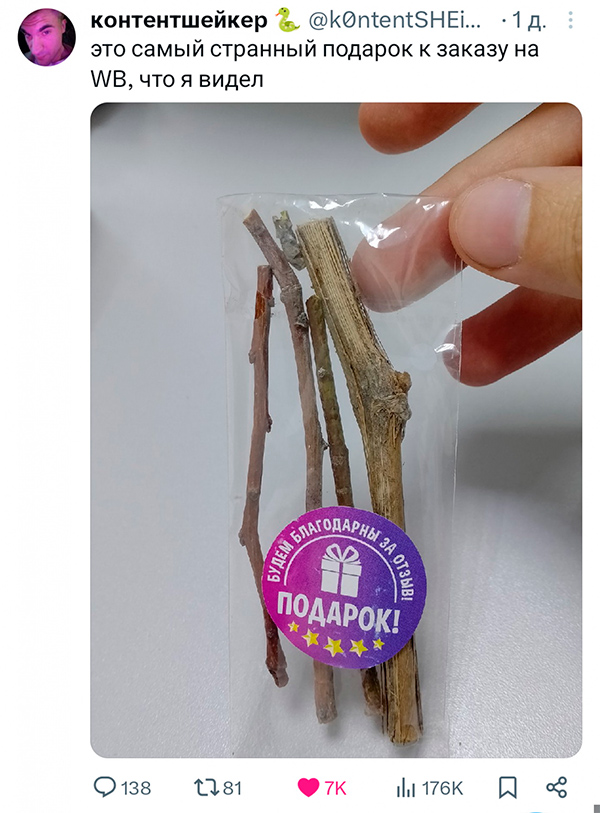 Про палочки от WB я видел оригинальный тред - это какие-то особо вкусные палочки для котов. Выглядят, конечно, как просто палочки. Автор поста явно был в контексте, ибо такое подкладывают обычно в заказ вместе с кормом.