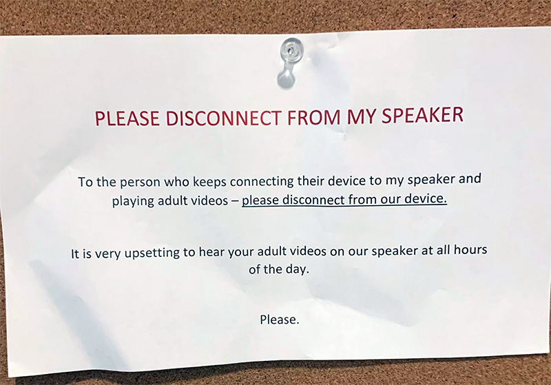 Тот человек, который подключил свои устройства к моей колонке и проигрывает видео для взрослых - пожалуйста, отключитесь от нашего устройства.