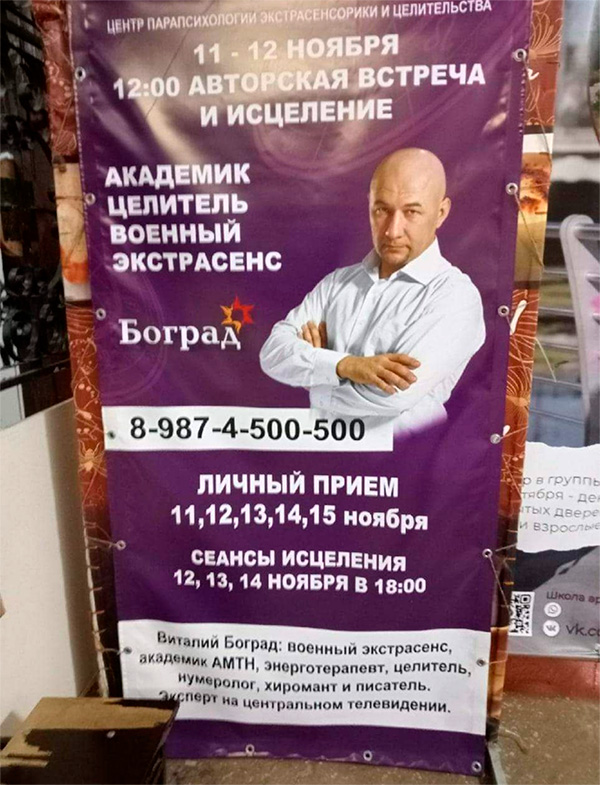 Анна считает, что уж на его-то выступление обязательно нужно пройти! Военный экстрасенс! Академик Академии Международных Транспортных Новаций! Энерготерапеут! Почетный шаман Сообщества казаков Таиланда! А главное - эксперт на центральном телевидении! Лечит одним чихом. Помогает вырастить волосы на месте лысины. Очень разносторонний человек. От его взгляда дохнут мухи и пчелы перестают нести яйца! Только три сеанса!