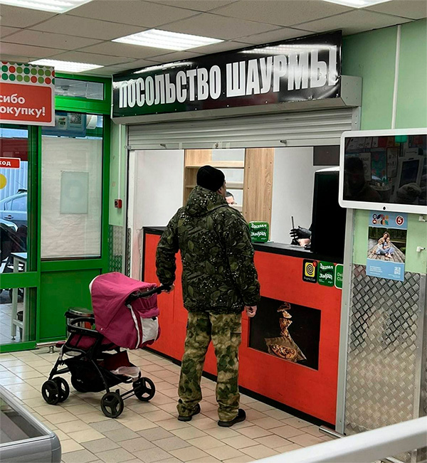 Про шаурму. На Ленинградском вокзале в Москве перед выходом к перронам висит реклама заведения: "Закажите у нас шаурму. Дальше будет только шаверма".