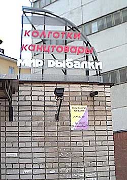 А посмотрите, как точно и четко выбрана специализация магазинчика! Все в одном комплекте - просто мечта рыбака! Колготки - чтобы умилостивить домашних, дабы они отпустили на рыбалку. Покупаешь жене фильдиперсовые колготки, теще - ватные на меху, после чего тебя с благословениями отпускают. Из канцелярских скрепок можно сделать хорошие крючки - так даже дешевле получится. А в "Мире рыбалки", говорят, можно купить водку по оптовым ценам. И все! К рыбалке ты готов!