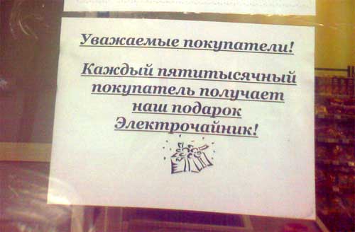 Внутри на двери никакого счетчика не стояло. На вопрос продавщице, как они узнают, какой покупатель пятитысячный, продавщица тетя Клава почесала в репе и сказала, что она сама на глазок определяет. "Вот ты, например, двадцыть седьмой!" - объяснила тетя Клава и широко улыбнулась во все свои золотые зубы.