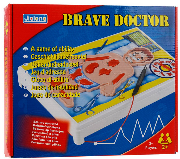 Игровая доска представляет собой операционный стол с лежащим на нем пациентом. Перед началом игры необходимо разместить части тела пациента в соответствии с их формой на игровой доске. В верхнем углу стола находится стрелка, указывающая на части тела.