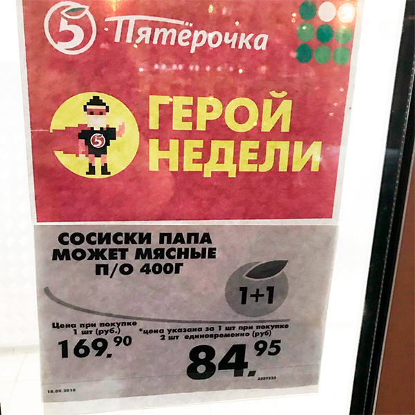 В "Пятерочке" интересный герой недели, удивляется Sad Smally. Сосиски "Папа". И честно пишут, что, может, мясные, а может, и нет.