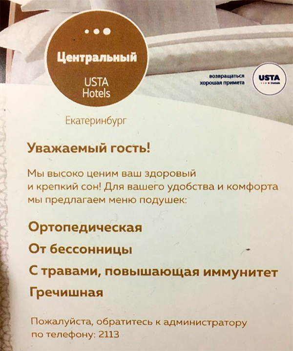В Екатеринбурге, рассказал Александр, так ценят постояльцев, что предлагают меню подушек. Там особенно подушка "с травами, повышающая иммунитет" смотрится очень трогательно. Напихали сена в подушку, написали "Подушка с травами, повышающая иммунитет" - и трава теперь не расти! Кстати, сказал Александр, в тот день, когда он был в этом отеле, там не было горячей воды. Но зато меню подушек! Также, кстати, интересно посмотреть на подушку от бессонницы. Она вслух овец считает, что ли?