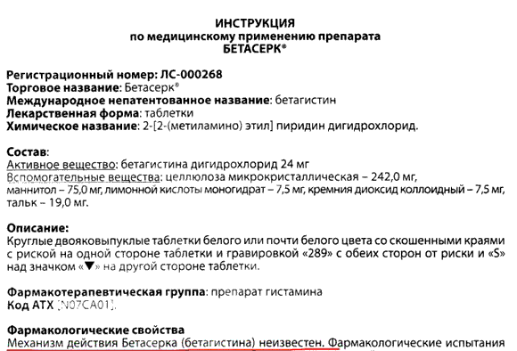 Механизм действия Бетасерка (бетагистина) неизвестен