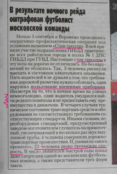 В Воронеже, рассказал Сергей, гоняются за какими-то трейсерами. А ловят резко превысивших скорость алкашей, нарушивших правила пользования внешними приборами.