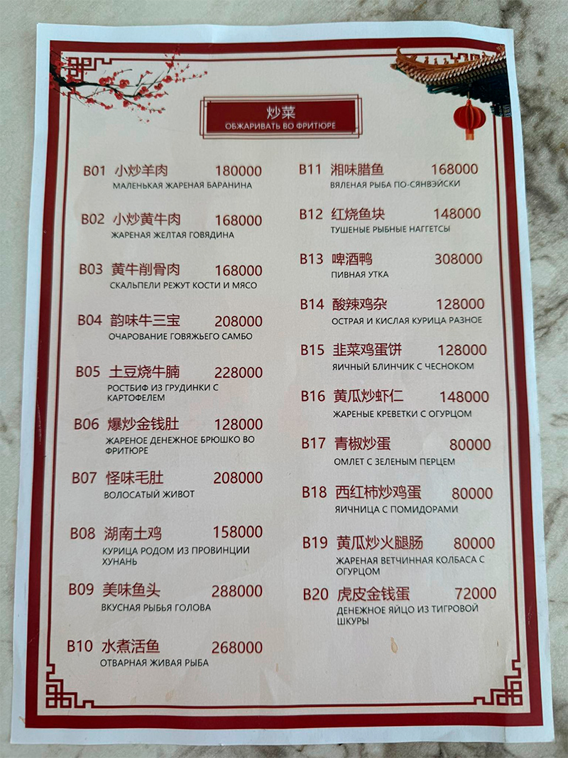 Ну, в принципе, считает Голодный Харитон, можно попробовать желтую говядину, жареное денежное брюшко, волосатый живот и денежное яйцо из тигровой шкуры. Надо же изучать местную кухню, правильно?
