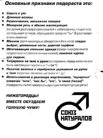 Ну что, проверили себя? Выбрит, жестикулируешь при разговоре, употребляешь неопределенный артикль "типа" - пидераст, однозначно! Впрочем, лишь бы эта листовка не попала в руки к бандюганам, которые таскают перстни-печатки и кошмарно коверкают литературную речь. Тогда союзу натуралов точно конец придет. Трахнут, однозначно.
