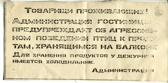 Да-да, вот такие кошмарные дела. Положишь колбасу на балконе, а пролетающий воробей ей морду набьет. Или оскорбит матным словом, в результате чего колбаса скуксится и посинеет. Поэтому храните колбасу у дежурной. Там, правда, она тоже не будет в безопасности - дежурной ночью очень жрать хочется, - однако колбаса хоть умрет без оскорблений. Послужит на благо гостиничному обществу.