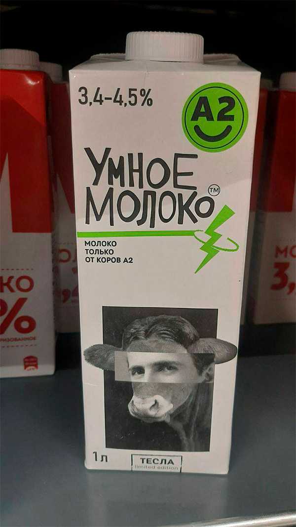 "Ключевые герои – коллажи с образами известных ученых, умных, известных людей. Такое решение приносит покупателю радость узнавания, чувство разгадки. Возникает простая, но хорошая связка: «видишь/пьешь УМНОЕ МОЛОКО – чувствуешь себя умным»".