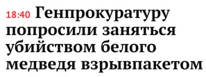 В принципе логично, считает Сергей. При той хрени, которой генпрокуратура занимается сейчас, уж лучше бы они занялись убийствами белых медведей взрывпакетами или еще чем-нибудь. Белые медведи все равно очень противные: они своих детенышей едят.