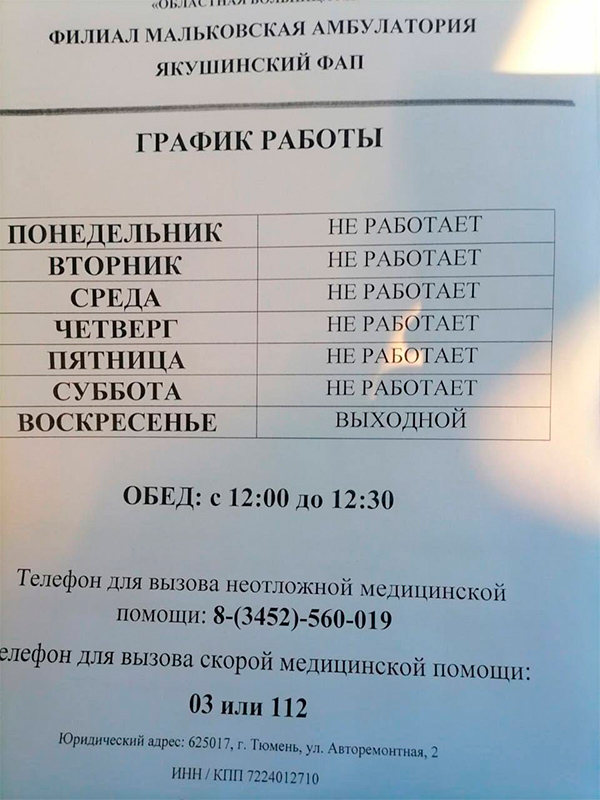 Хорошо устроился филиал мальковской амбулатории, считает Genius. С понедельника по субботу он не работает, но зато в воскресенье наслаждается заслуженным отдыхом.
