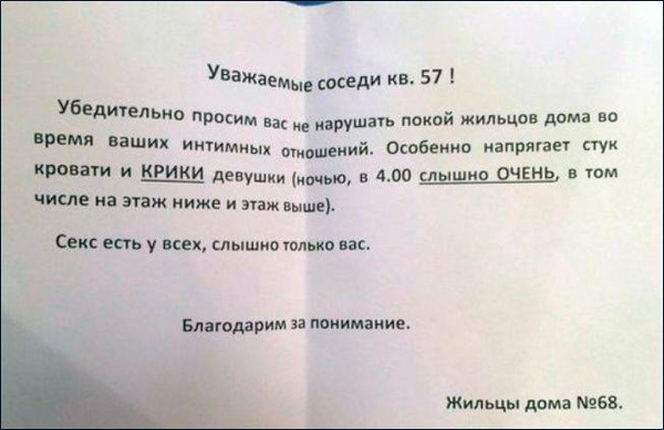 Последняя картинка прикольная. Сидишь так вот на дежурстве в ночную и вдруг приходит смс от соседа с просьбой трахаться потише.