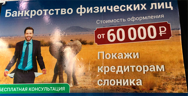 Кстати, действительно креатив и действительно смешно. Впрочем, банкротство - это не совсем (а точнее, совсем не) "покажи кредиторам слоника", но в этом клиенты данной конторки убедятся только после того, как расстанутся с 60 тысячами рублей.