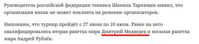Похоже, вздыхает R Z, алтайское издание "АМИТЕЛ" теннис с бадминтоном спутало. Вторая ракетка мира по теннису - это Даниил Медведев. А Дмитрий Медведев - это вторая ракетка по бадминтону. Первая ракетка, конечно, у Путина.