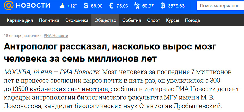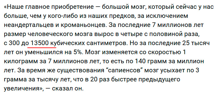 Да и с 7-ью миллионами непонятненько. Человеки вроде 2.5 млн. лет назад только начались. А то ведь можно копнуть глубже и сказать, что по сравнению с мозгом рыб живших 300 млн. назад мозг вырос сотни раз.