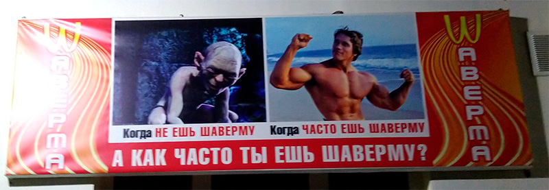 От шавермы, замечает Марат, станет всем теплее! Чем ты чаще шаверму ешь, тем ты больше - Шварценеггер! Не в рифму. Зато круто!