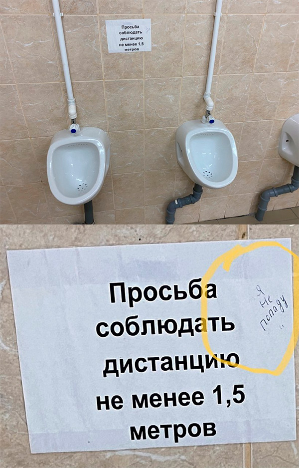 В торговом центре у метро "Ясенево", рассказал Николай, как следует позаботились о безопасном расстоянии от писсуаров. Во избежание заражения писсуаров коронавирусом.