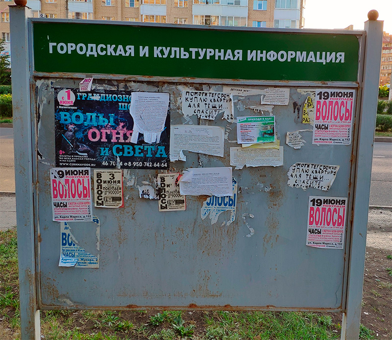 Вот так глянешь на стенд городской и культурной информации, радуется Павел, и сразу поймешь, чем живет город. Волосами он живет и квартирой для тещи.