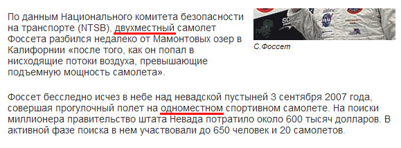Оказывается, его двухместный самолет в полете превратился в одноместный. Причем пострадало как раз место Фоссета. Ну и все, у него не было никаких шансов.