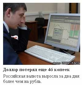Российская валюта - это рубль. Рубль вырос за два дня более чем на рубль - это круто. Но еще веселее тот факт, что доллар потерял сорок шесть копеек. Я так думаю, что если журналист, написавший эту новость, месяц посидит на кефирчике, то ему это точно поможет.