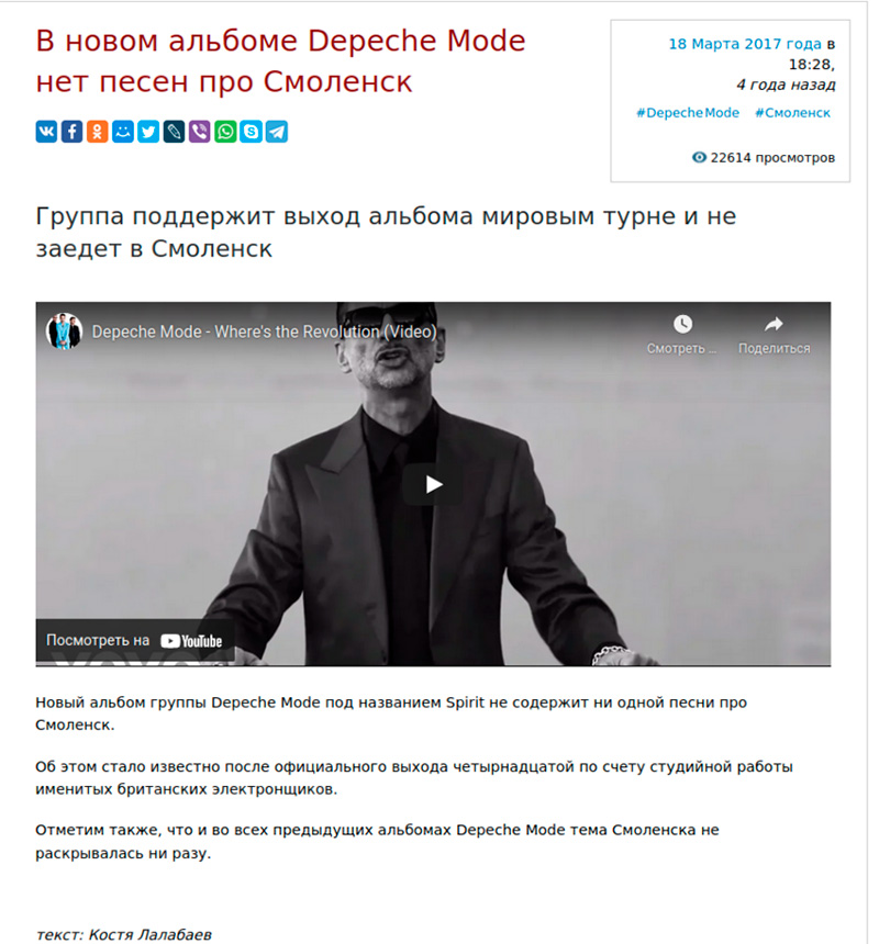 Что-то Депеша совсем испортились. Раньше ведь во всех альбомах, даже в инструментальных, про Смоленск обязательно пара песен была.