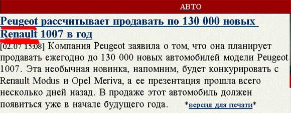Представляете, "Пежо" рассчитывает продавать по 130 тыс. новых "Рено 1007"! Машин, которых в природе не существует! Какие мысли? Вероятно, речь идет просто о десятке "Жигулей". К ней прилепят значок "Рено" и начнут продавать в салонах "Пежо". Зачем? А чтобы потом негодующие покупатели затаили на "Рено" жуткую обиду. Черный пиар, так сказать...