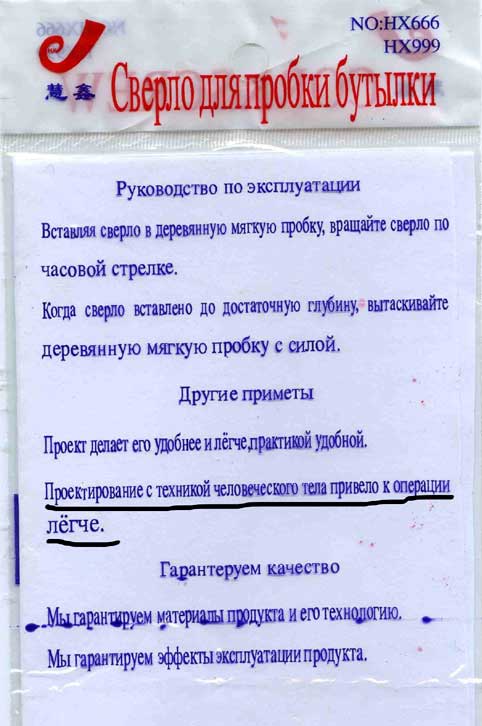 Китайцы совсем перестали напрягаться с русским языком, сообщила Марина. Раньше они еще хоть как-то пытались осмыслить перевод, а теперь вообще лепят программой-дебилизатором. Получаются истинные шедевры: