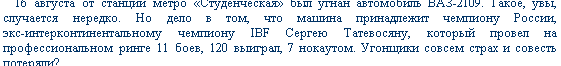 (поддакивая) Ага, ага, совсем совесть потеряли. А главное - страх! Нет чтобы узнать, кому принадлежит машина! Ведь если он выиграл 120 боев из 11 - это означает, что 109 соперников он просто стер с лица Земли! Так что угонщики пусть лучше угоняют тачки у каких-нибудь паршивых пенсионеров или студентов, а не у таких заслуженных мордобойцев! Мы возмущены! Вся общественность возмущена!