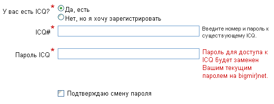 На Bigmir.net, возмущается Alex A. Logvinov, совсем офигели! При регистрации на портале они требуют сообщить номер и пароль ICQ, причем пароль к аське в обязательном порядке заменяют паролем на "Бигмире". "А ху-ху им не хо-хо?" - риторически спрашивает Alex: