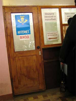 Вход, конечно, довольно обшарпанный, но и Интернет, судя по плакатику, состоит из двух вшивых музыкальных инструментиков. Видать, это какой-то FTP с пиратскими mp3.