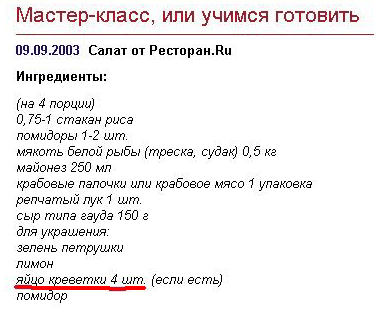 Ревизор учится готовить с помощью сайта "Ресторан.ру". Вот только яйцо креветки озадачило, четыре штуки. Дело в том, что у креветок нет яиц. Только икра. Но если икру считать яйцами, тогда попробуйте отделить четыре штучки - вам понравится...