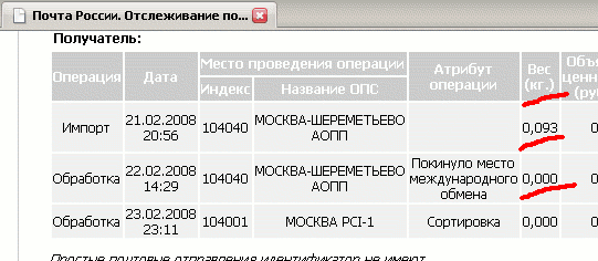 Как видите, после обработки место международного обмена ничего не покинуло - посылочка сгинула в недрах таможни. Правда, на сортировке она снова всплыла - вполне возможно, что в виде пустого конверта, который уже не фиксируется щупальцами таможенных весов.
