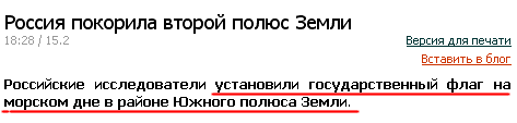 Издание "Дни.ру", рассказал Виталий, бодро отрапортовало о новой победе российских исследователей, которые в снегах и льдах Антарктиды не только обнаружили неизвестное науке море, но и сумели установить на его дне государственный флаг. А всякие Амудсены и Скотты на собачьих упряжках Южный полюс покоряли - не проконсультировались, дурачки, с "Днями.ру".
