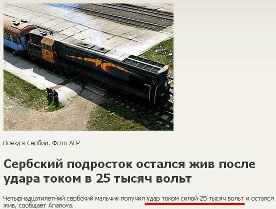 Но это еще ладно, замечает Алексей. Тут несколько десятков Средств Мозгового Изнасилования напечатали волнующую новость о мальчике, которого ударило током с силой в 25 тысяч вольт!